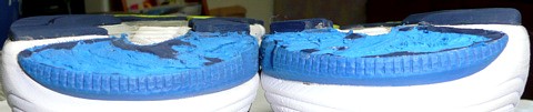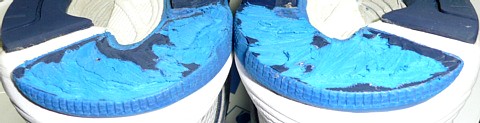 | 【作業4】切り取ったアウトソール部分をミッドソールに貼りました。接着には液状の瞬間接着剤(いわゆるアロンアルファ的接着剤、100円ショップで購入)を使用しました。 |